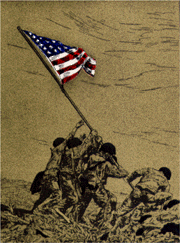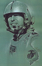 The drawing is a depiction of a man with flight gear on and a partial map of the coastal area of Vietnam, with the Marine Corps emblem